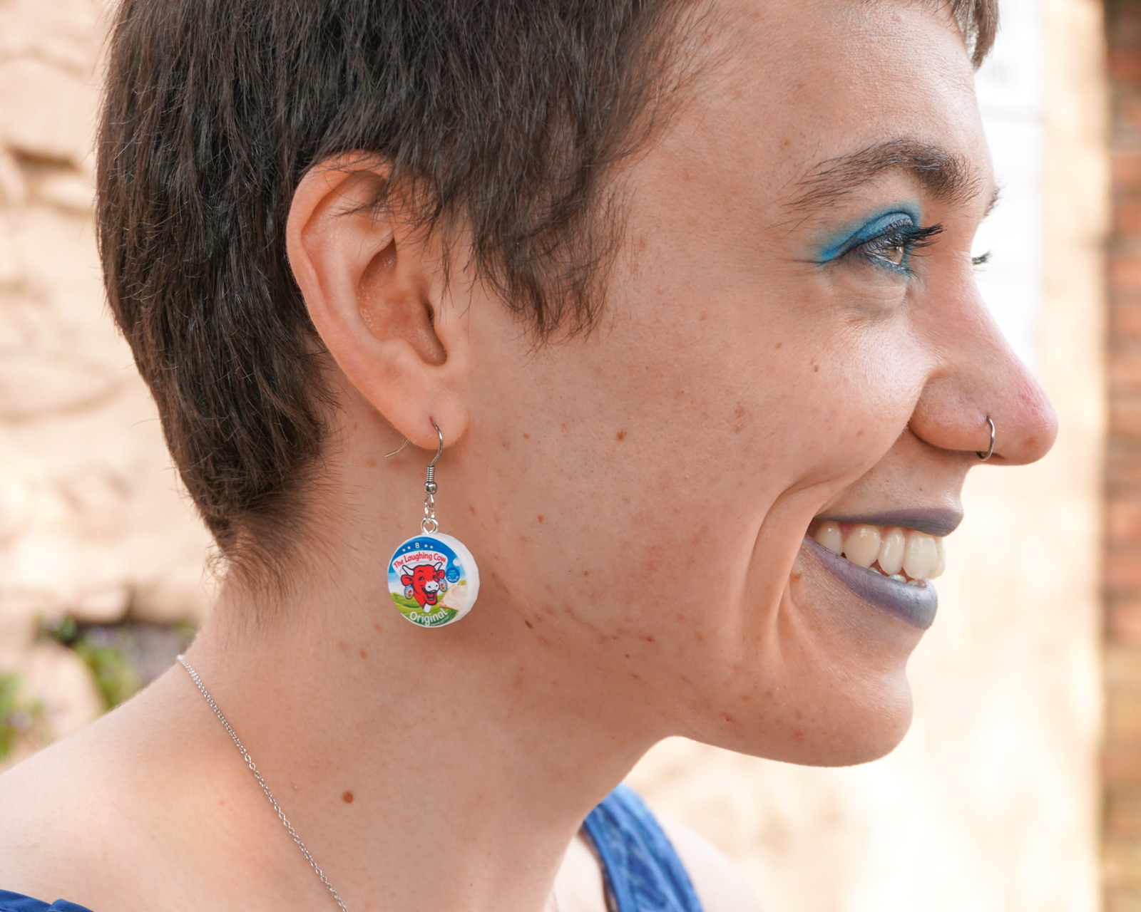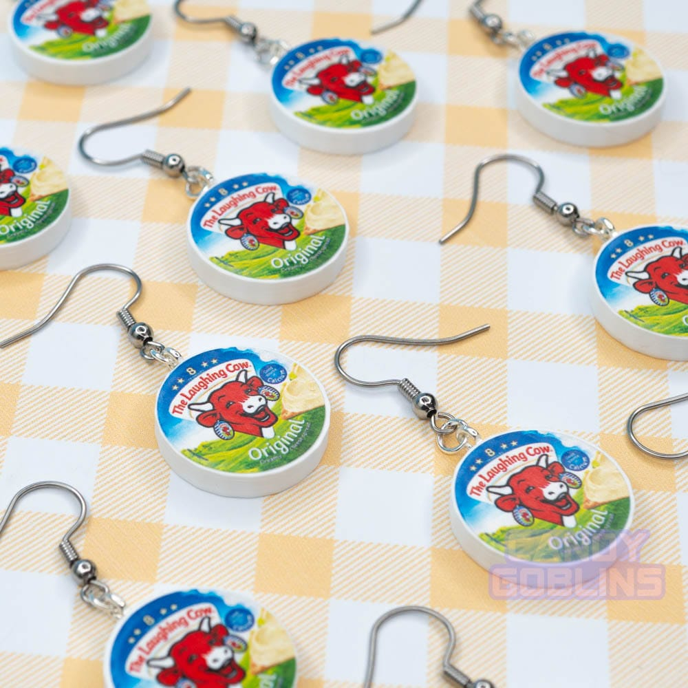 These Laughing Cow earrings are a perfect miniature of the real thing! We 3D printed the base, so it’s super lightweight and sturdy. The design is added using gloss stickers. The gloss gives the design some water protection but don’t wipe with water or get them wet as the design may fade or degrade. They should be stored out of direct sunlight.
